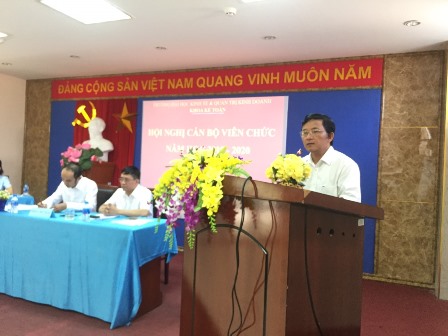 Hội nghị đã nghe PGS.TS. Trần Quang Huy - Phó Bí thư Đảng ủy, Hiệu trưởng Nhà trường phát biểu ý kiến chỉ đạo. Đồng chí hoan nghênh và ghi nhận những thành tích mà Khoa Kế toán đã đạt được trong năm học 2018-2019 về Đào tạo, NCKH và phát triển đội ngũ,…. Đồng thời yêu cầu trong năm học tới Khoa Kế toán cần phải bám sát nhiệm vụ năm học của Nhà trường để xây dựng kế hoạch nhiệm vụ của Khoa; Tăng cường việc thực hành cho sinh viên để đáp ứng được yêu cầu thực tế hiện nay, nhiệm vụ là phải xây dựng các chương trình thực hành kế toán phục vụ cho việc thành lập phòng Thực hành Kế toán và Tài chính – Ngân hàng của Nhà trường; Phát huy khả năng của Khoa trong việc tìm kiếm các đề tài NCKH và chuyển giao công nghệ cho các địa phương; Mở rộng quan hệ quốc tế trong NCKH và đào tạo; Đẩy mạnh việc đào tạo giảng viên có trình độ Tiến sĩ và học ngoại ngữ cho giảng viên, đôn đốc NCS thực hiện đúng hạn luận án,…